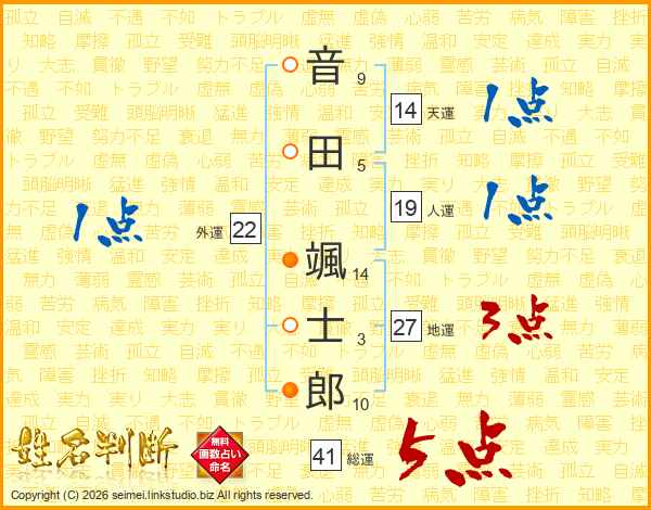 音(9画)田(5画) 颯(14画)士(3画)郎(10画)