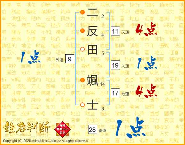 生活面を象徴する運勢です。外部から受ける影響力を表し、結婚運、家庭運や職場、環境への順応性を表します。総運から人運を引いた画数。姓や名が1文字の場合を除く。