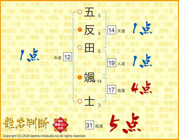 生活面を象徴する運勢です。外部から受ける影響力を表し、結婚運、家庭運や職場、環境への順応性を表します。総運から人運を引いた画数。姓や名が1文字の場合を除く。