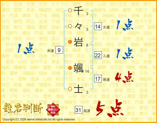 千(3画)々(3画)岩(8画) 颯(14画)士(3画)