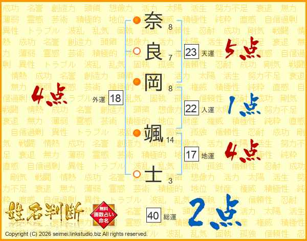 奈(8画)良(7画)岡(8画) 颯(14画)士(3画)