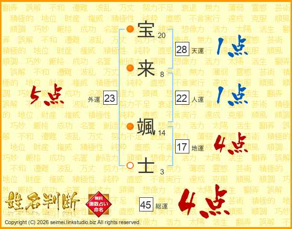 生活面を象徴する運勢です。外部から受ける影響力を表し、結婚運、家庭運や職場、環境への順応性を表します。総運から人運を引いた画数。姓や名が1文字の場合を除く。