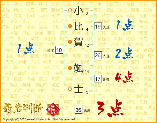小(3画)比(4画)賀(12画) 颯(14画)士(3画)