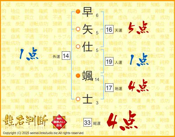 早(6画)矢(5画)仕(5画) 颯(14画)士(3画)