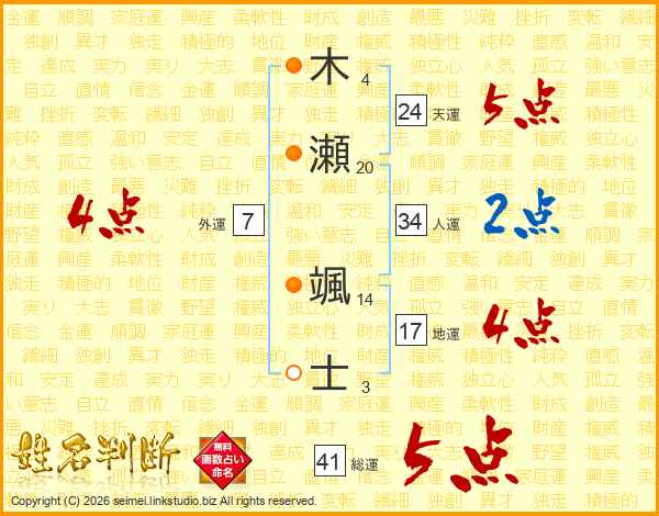 木(4画)瀬(20画) 颯(14画)士(3画)