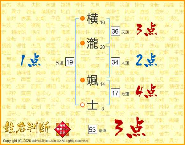 横(16画)瀧(20画) 颯(14画)士(3画)