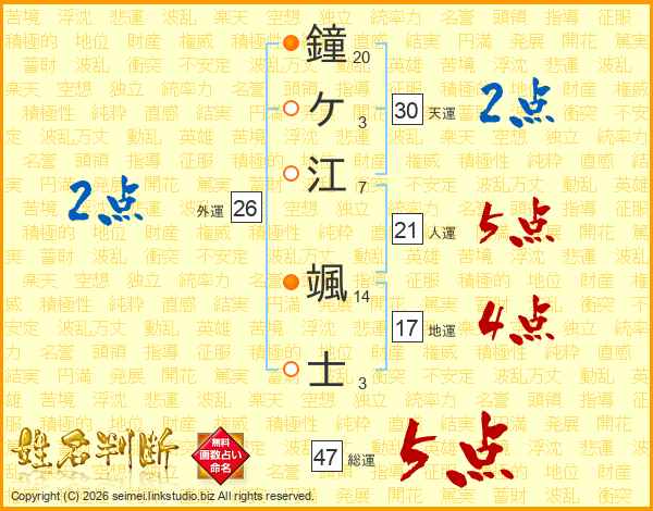 鐘ケ江颯士さんの総運は47画の5点!