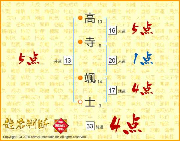 生活面を象徴する運勢です。外部から受ける影響力を表し、結婚運、家庭運や職場、環境への順応性を表します。総運から人運を引いた画数。姓や名が1文字の場合を除く。