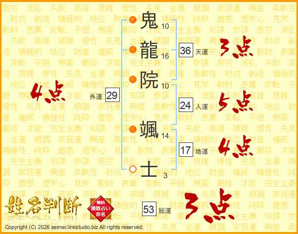 鬼(10画)龍(16画)院(10画) 颯(14画)士(3画)