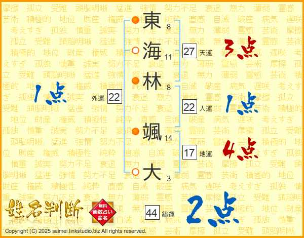 東(8画)海(11画)林(8画) 颯(14画)大(3画)