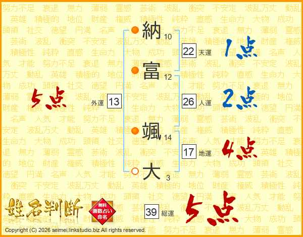 納富颯大さんの総運は39画の5点!