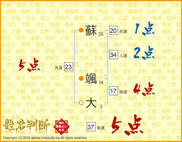 生活面を象徴する運勢です。外部から受ける影響力を表し、結婚運、家庭運や職場、環境への順応性を表します。総運から人運を引いた画数。姓や名が1文字の場合を除く。