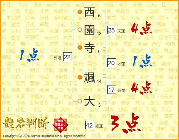 西(6画)園(13画)寺(6画) 颯(14画)大(3画)