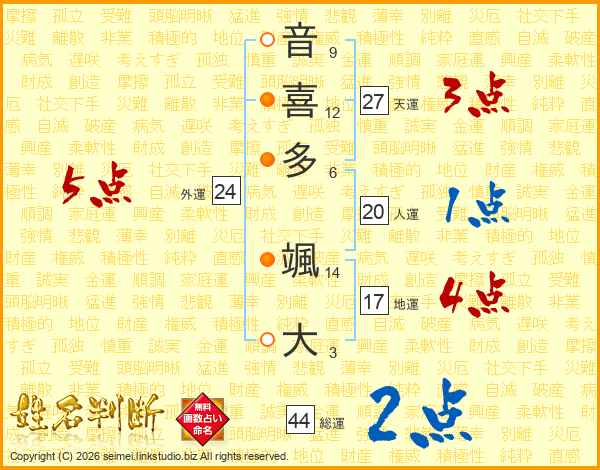 音(9画)喜(12画)多(6画) 颯(14画)大(3画)