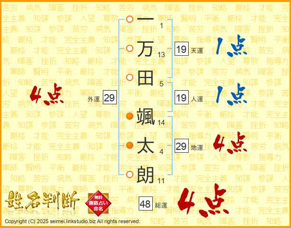 一(1画)万(13画)田(5画) 颯(14画)太(4画)朗(11画)
