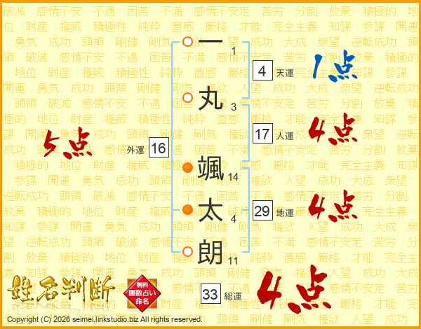 一(1画)丸(3画) 颯(14画)太(4画)朗(11画)