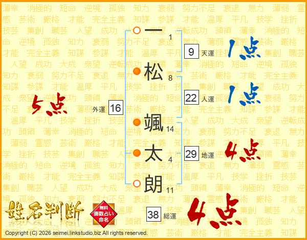 一(1画)松(8画) 颯(14画)太(4画)朗(11画)