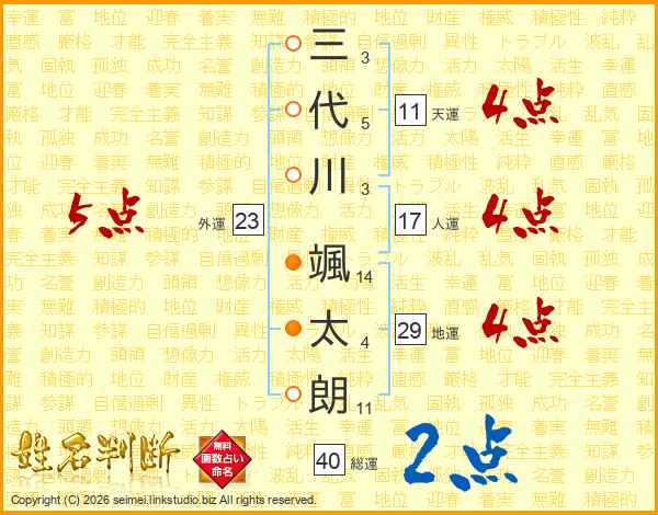三(3画)代(5画)川(3画) 颯(14画)太(4画)朗(11画)