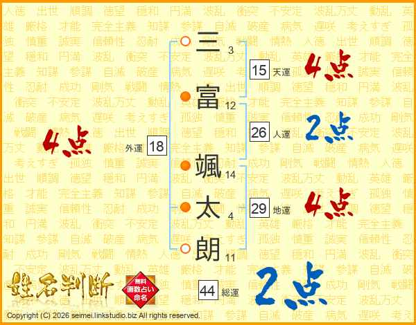 三(3画)富(12画) 颯(14画)太(4画)朗(11画)
