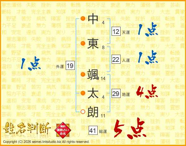 中(4画)東(8画) 颯(14画)太(4画)朗(11画)