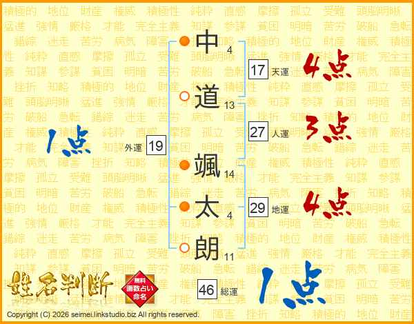 中(4画)道(13画) 颯(14画)太(4画)朗(11画)