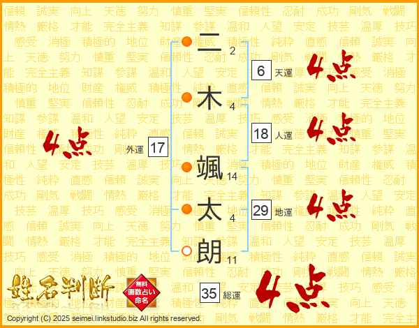 二(2画)木(4画) 颯(14画)太(4画)朗(11画)