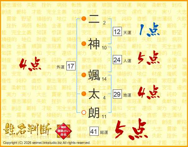 二(2画)神(10画) 颯(14画)太(4画)朗(11画)