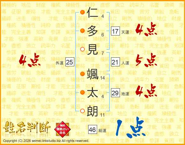 仁(4画)多(6画)見(7画) 颯(14画)太(4画)朗(11画)