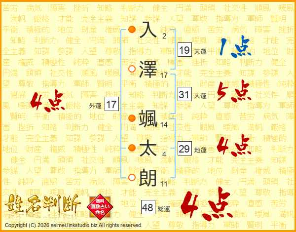 入(2画)澤(17画) 颯(14画)太(4画)朗(11画)