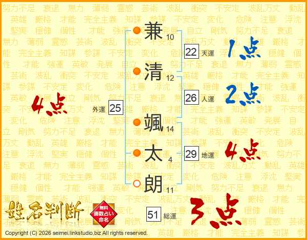 兼(10画)清(12画) 颯(14画)太(4画)朗(11画)