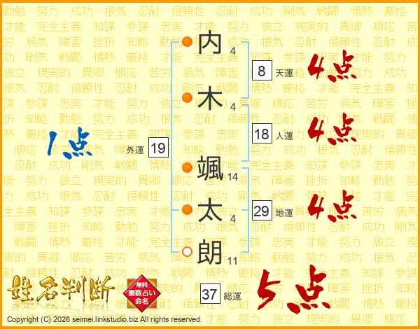 内(4画)木(4画) 颯(14画)太(4画)朗(11画)