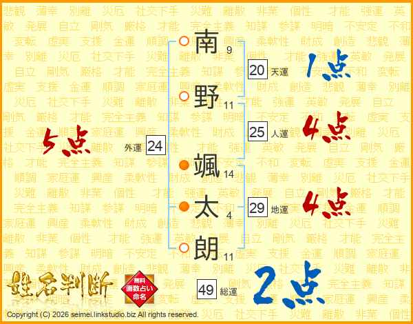 南(9画)野(11画) 颯(14画)太(4画)朗(11画)
