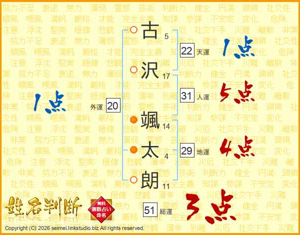 古(5画)沢(17画) 颯(14画)太(4画)朗(11画)