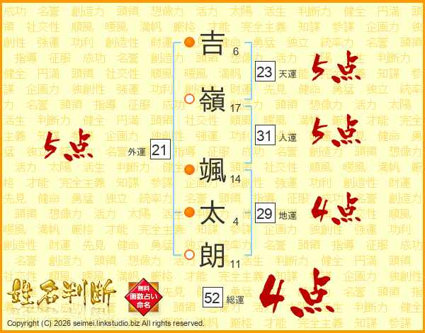 吉(6画)嶺(17画) 颯(14画)太(4画)朗(11画)
