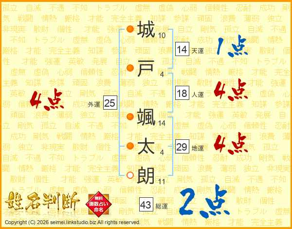 城(10画)戸(4画) 颯(14画)太(4画)朗(11画)