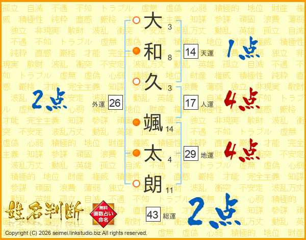 大(3画)和(8画)久(3画) 颯(14画)太(4画)朗(11画)