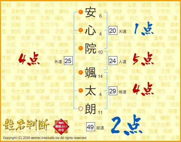 安(6画)心(4画)院(10画) 颯(14画)太(4画)朗(11画)