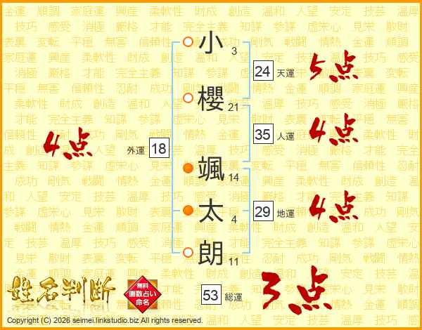 小(3画)櫻(21画) 颯(14画)太(4画)朗(11画)