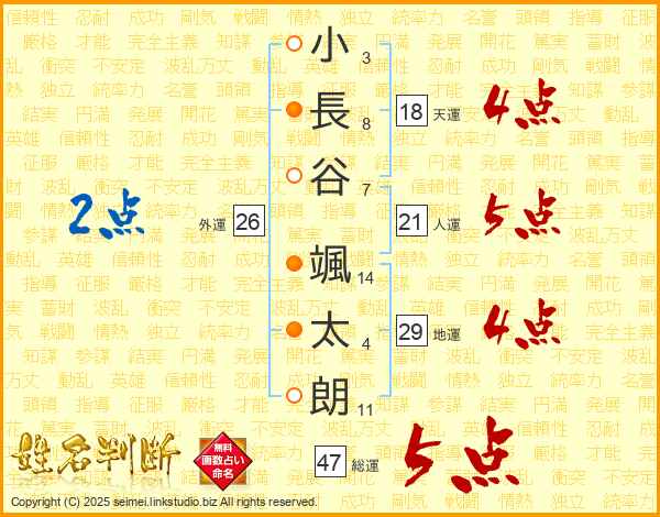 小(3画)長(8画)谷(7画) 颯(14画)太(4画)朗(11画)