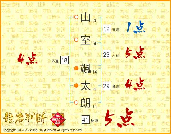 山(3画)室(9画) 颯(14画)太(4画)朗(11画)
