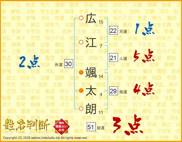 広(15画)江(7画) 颯(14画)太(4画)朗(11画)