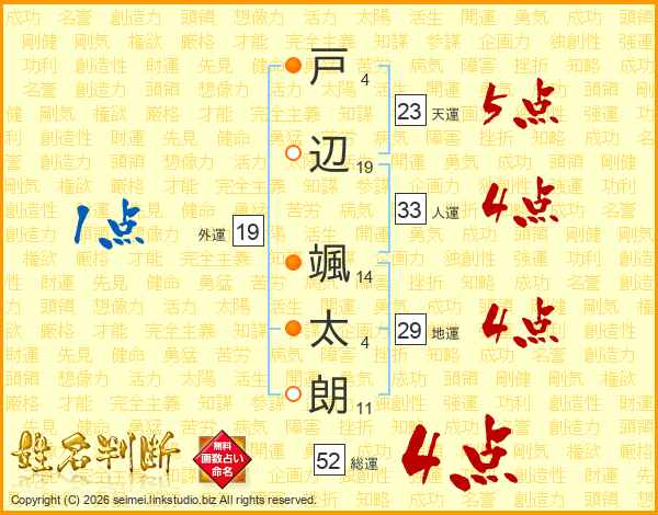 戸(4画)辺(19画) 颯(14画)太(4画)朗(11画)