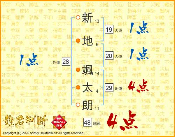 新(13画)地(6画) 颯(14画)太(4画)朗(11画)