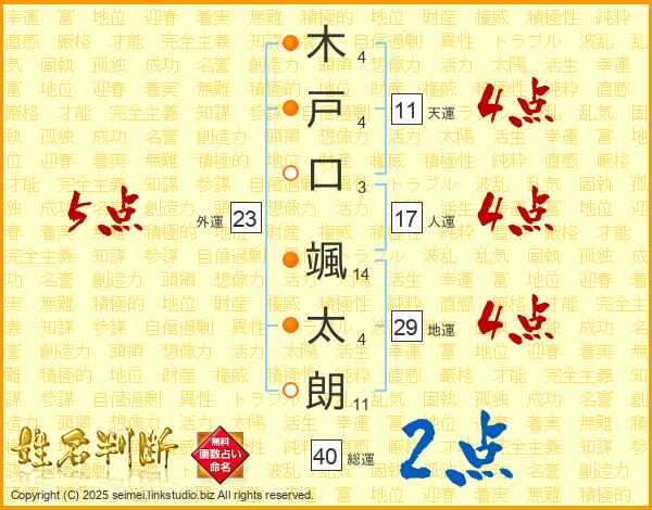 木(4画)戸(4画)口(3画) 颯(14画)太(4画)朗(11画)