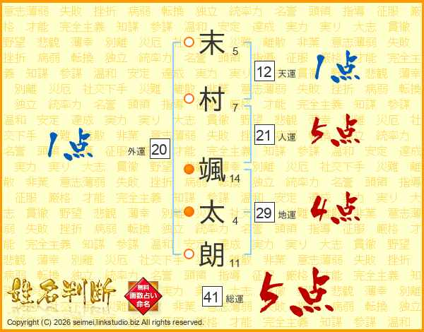末(5画)村(7画) 颯(14画)太(4画)朗(11画)