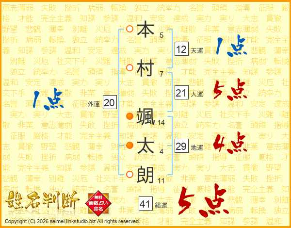 本(5画)村(7画) 颯(14画)太(4画)朗(11画)