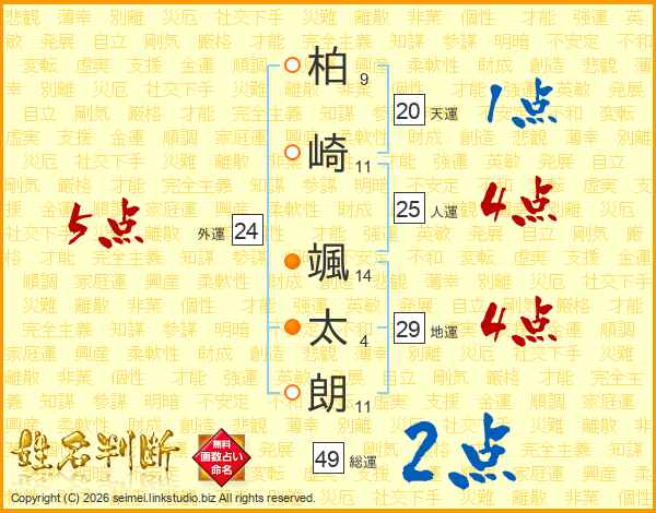 柏(9画)崎(11画) 颯(14画)太(4画)朗(11画)