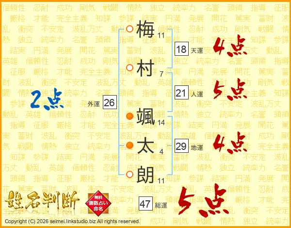 梅(11画)村(7画) 颯(14画)太(4画)朗(11画)