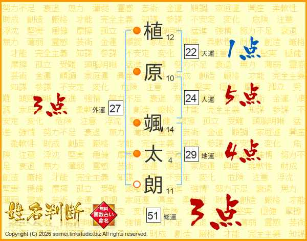 植(12画)原(10画) 颯(14画)太(4画)朗(11画)