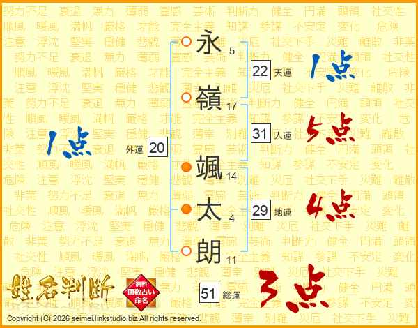 永(5画)嶺(17画) 颯(14画)太(4画)朗(11画)